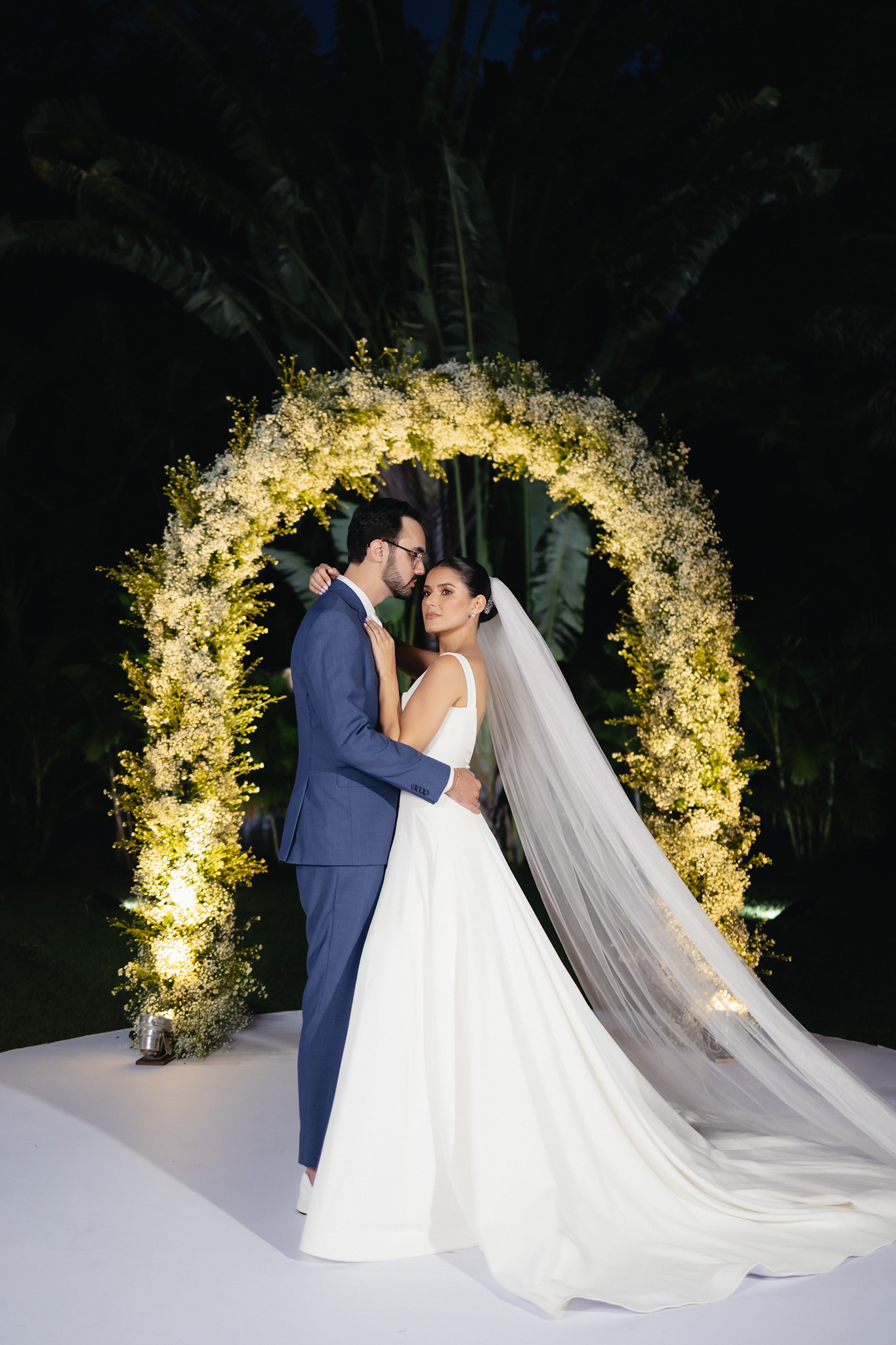 Carol e Yan já moravam juntos quando decidiram se casar. Foi uma decisão importante para eles, buscando a graça e a bênção de Deus, pois são evangélicos. O casamento tinha muita identidade e personalidade. Na hora de definir a paleta de cores, Carol não impôs restrições e me deixou bastante livre para criar. Ela mencionou acidentalmente que tinha uma tatuagem de girassol. Fiquei curiosa e pedi para vê-la. Era uma tatuagem no braço.